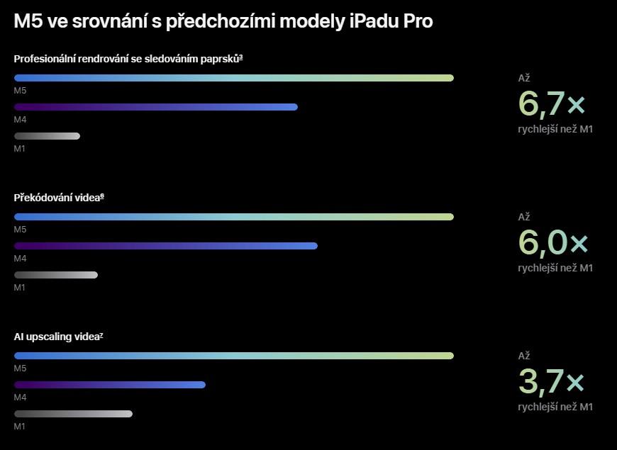 Nyní se tedy pojďme podívat na to, co je nového. V útrobách iPadu Pro tiká nový čipset Apple M5, který má v tabletu nabídnout znatelně vyšší výkon, zejména v oblasti umělé inteligence. Aby Apple nárůst výkonu co nejvíce zveličil, srovnává jej s 5 let starým čipem Apple M1, oproti němuž má novinka nabídnout: