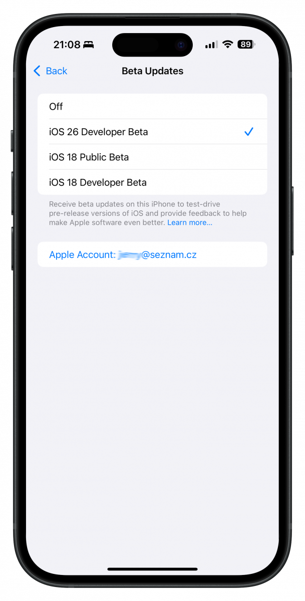 Na iPhonu stačí přejít do nabídky Nastavení – Obecné – Aktualizace softwaru. Zde klikněte na nabídku Aktualizace betaverzí, kde byste měli mít volbu iOS 26 Developer Beta. Tu stačí aktivovat a následně zkontrolovat dostupnost aktualizací – během chvilky by mělo začít stahování.