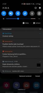 Stačí zapnout televizi a poté na telefonu v liště s rychlými přepínači spustit režim DeX. Po krátkém hledání televizoru už můžete zahájit bezdrátové spojení. To probíhá přes Wi-Fi Direct.