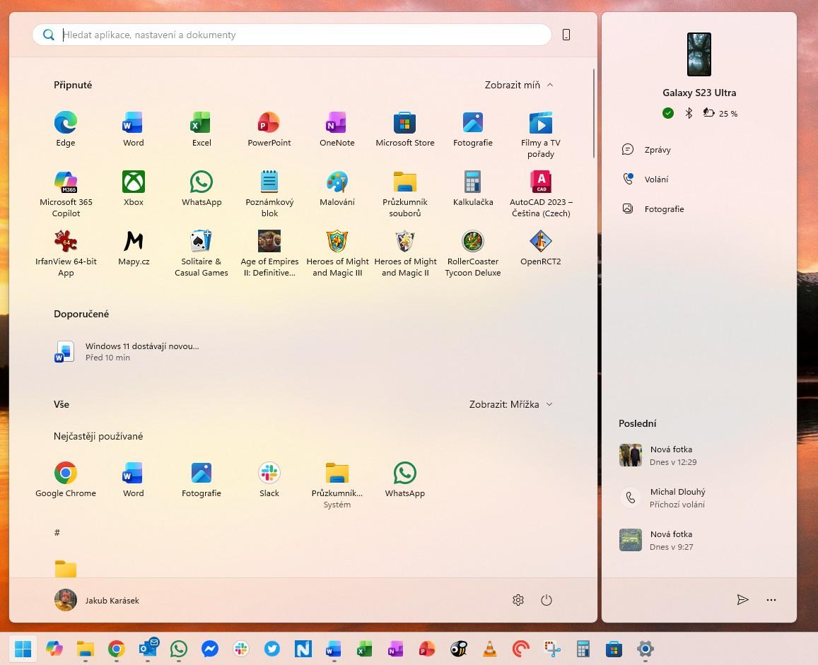 Do nabídky Start rovněž přibyl poslední panel zobrazující informace ze spárovaného telefonu. Odtud je na první pohled patrný stav nabití, zmeškané hovory či zprávy, ve spodní části se pak nachází seznam posledních položek – nedávné fotky, zprávy, hovory nebo oznámení. Z tohoto panelu lze také rychle posílat do telefonu soubory.
