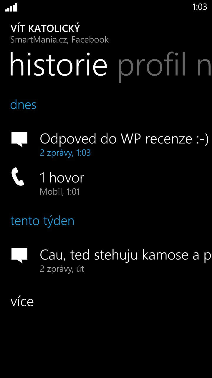 Shodné kontakty pod jednotlivými účty mezi sebou můžete provázat, v případě shody jmen to systém dokonce udělá automaticky. Když si pak rozkliknete detail nějakého kontaktu, rovnou se vám u něj zobrazí třeba novinky z jeho Facebooku, fotografie a další údaje. Rovnou mu také můžete napsat na jeho zeď. V provázání se sociálními sítěmi jsou Windows Phone 8 bezkonkurenční, vše máte pod jednou střechou a ihned po ruce. Pod záložkou historie pak vidíte kompletní komunikaci s daným kontaktem včetně e-mailů a textových zpráv.