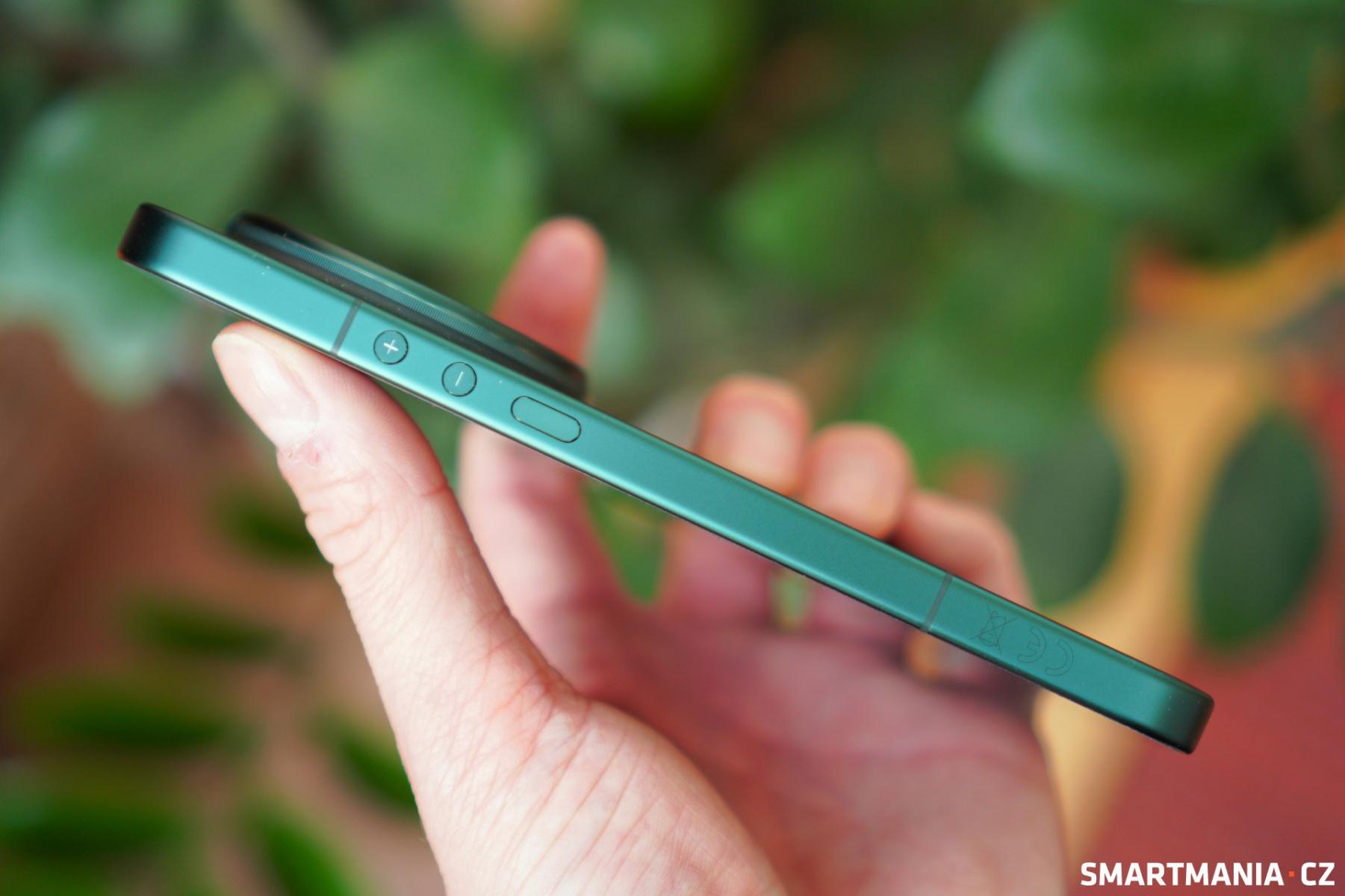 Rovný hliníkový rám mě také velmi baví a telefon se opravdu dobře drží. Čínský výrobce si na pravém boku pohrál i se vzhledem tlačítek – tlačítka pro ovládání hlasitosti jsou kruhová a označená symboly plus a mínus. Esteticky je vhodně doplňuje i tlačítko zapnutí, které by však podle mě mohlo být o něco větší.
