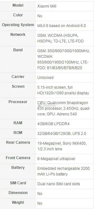 Obě novinky má pohánět výkonný čip Snapdragon 835 od Qualcommu. Plusová verze nabídne 5,7″ Full HD displej a 6 GB RAM, klasická varianta bude disponovat 5,15″ Full HD panelem a 4 GB RAM. V případě operačního systému padla tradičně volba na Android 7.0 obohacený o nadstavbu MIUI 8. V případě Xiaomi Mi6 je sice na screenshotu se specifikacemi uveden Android 6.0, ale do prodeje telefon půjde s Nougatem.