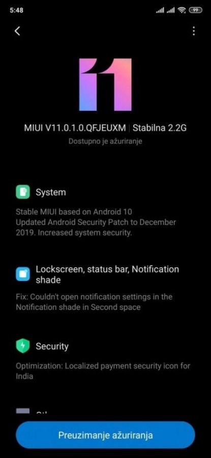 Přestože má aktualizace velikost okolo 2,2 GB, je seznam novinek poměrně skromný, neboť zásadní změny získali majitelé tohoto telefonu s dřívější aktualizací prostředí MIUI na verzi 11. Tento update přináší zejména upravenou zamykací obrazovku, stavovou lištu a pozměněný design notifikací. Kromě toho nechybí opravy některých chyb a aktuální prosincový balíček zabezpečení.