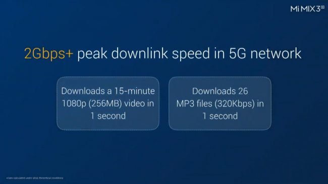 Xiaomi přímo v rámci své tiskové konference ukázalo úspěšný videohovor zprostředkovaný v 5G síti španělského operátora Orange. Díky sítím 5G má být telefon schopný stahovat data rychlostí 2 Gbps a vyšší, podle Xiaomi bude možné stáhnout 15minutové video ve Full HD o velikosti 256 MB za pouhou jednu vteřinu.