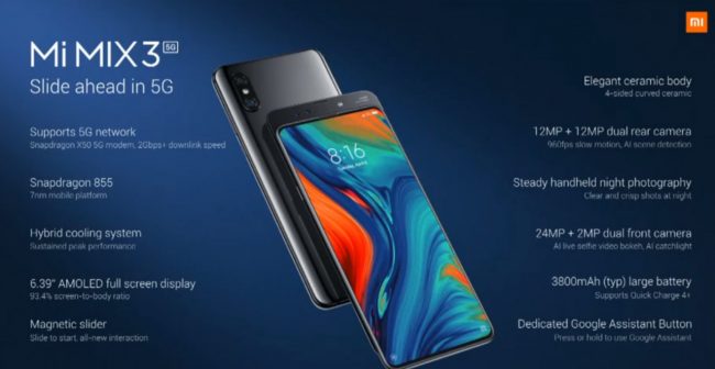 Společnost Xiaomi na veletrhu MWC představila inovovanou variantu smartphonu Mi Mix 3 (recenze). Jedná se prakticky stejný smartphone, jaký představen loni v říjnu, novinkou je však podpora sítí 5G, kterou zajišťuje čipset Qualcomm Snapdragon 855 ve spolupráci s modemem Snapdragon X50.
