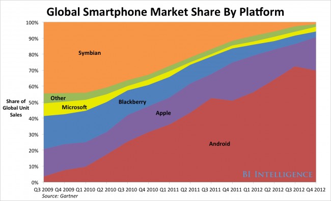I když prodeje zařízení s Windows Phone rostou, trh se smartphony roste rychleji, což v konečném důsledku znamená, že podíl dlaždicového systému klesá. Podle posledních dat agentury IDC je aktuální podíl WP na trhu 2,9% (loni to bylo 3,6%), což sice zajišťuje pohodlné třetí místo mezi všemi operačními systémy, konkurence je ovšem na míle daleko.