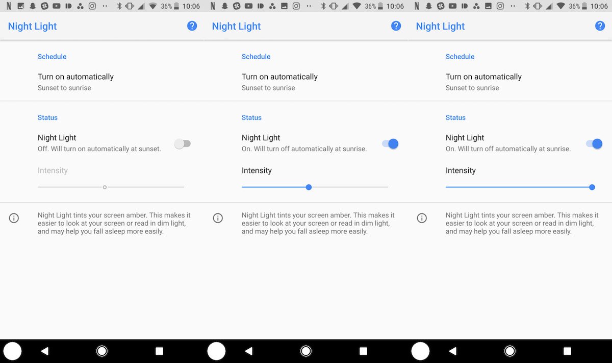 Noční režim se objevil už v první verzi Androidu O, v druhém Developer Preview Google zapracoval na možnostech nastavení – novinkou je posuvník, díky kterému můžete regulovat intenzitu filtru. Díky tomu si displej pro noční čtení nastavíte přesně tak, jak vám vyhovuje. Stejně jako u iOS, ani v nové verzi Androidu nechybí plánovač automatické aktivace režimu, buď podle východu a západu slunce, nebo podle vámi nastaveného časového intervalu.