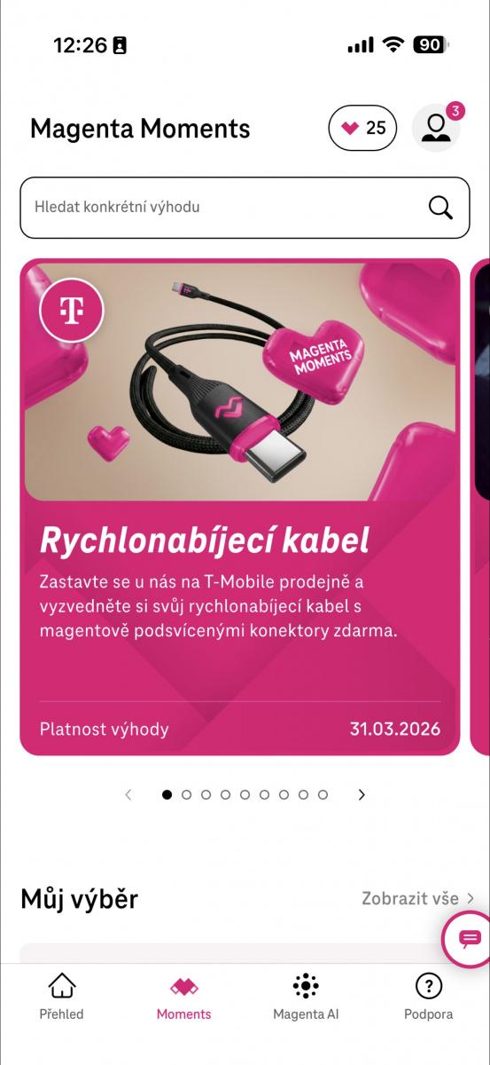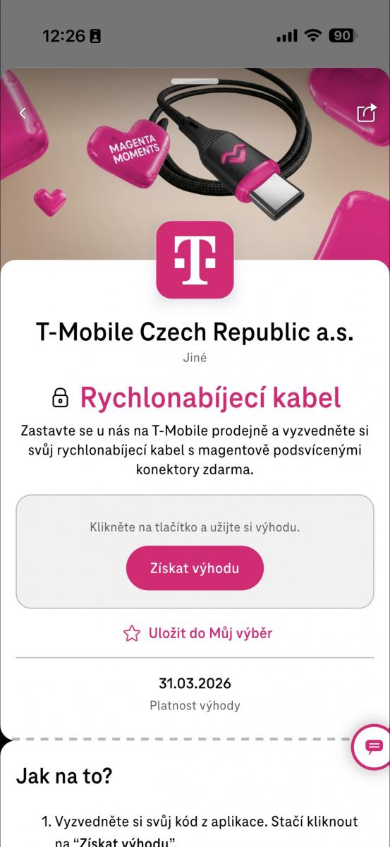 Vyzvednutí je velmi snadné – podobně jako tomu bylo v minulosti u dárků pro zákazníky v rámci programu Magenta Moments, například s ponožkami, termohrnkem nebo zmrzlinou v létě. Stačí benefit vyhledat v aplikaci Můj T-Mobile, konkrétně v sekci výhod Magenta Moments. Potvrďte zájem o výhodu a předložte unikátní kód obsluze na prodejně, ta vám následně vydá speciální brandovaný kabel USB-C.
