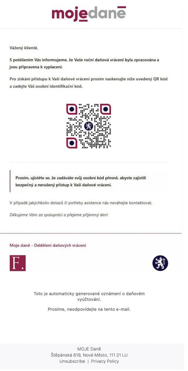 E-mail s hlavičkou „Vaše daňová vratka je připravena k vyřízení – Potvrzení od Finanční správy“ je hned prvním varováním, že něco není v pořádku. Finanční správa zpravidla s vyplácením peněz dvakrát nespěchá, nicméně vratka daně v prosinci je daleko za povinnou 30denní lhůtou. V samotném těle e-mailu lze poté zpozorovat další řadu varovných signálů, jako jsou gramatické a stylistické chyby, požadavek na naskenování QR a zadání osobního identifikačního kódu nebo odkaz na neexistující Oddělení daňových vrácení Finanční správy.