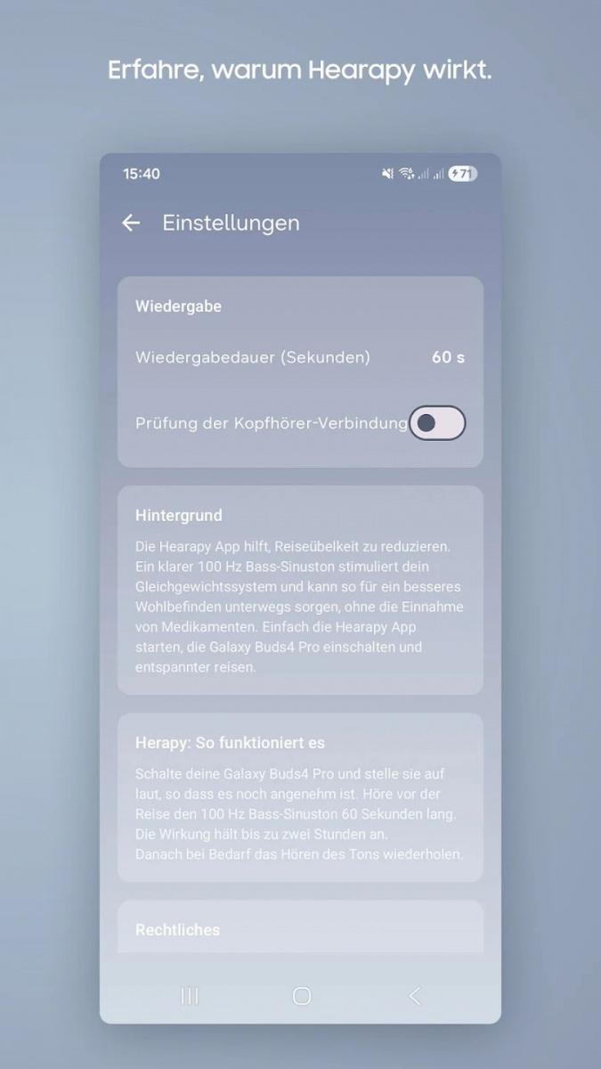 Tato nová aplikace se jmenuje Hearapy a je k dispozici v aplikačním obchodě Google Play. Je postavena na základě japonské studie provedené na Univerzitě v Nagoji, v jejímž rámci vědci zjistili, že nevolnost při cestování může výrazně zmírnit poslech sinusové vlny o frekvenci 100 Hz a hlasitosti 75–85 dB po dobu několika minut.