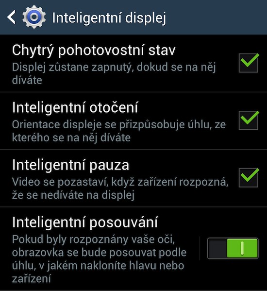 Když si jednotlivé nabídky nastavení budete procházet, zjistíte, že toho Galaxy S4 umí opravdu hodně. Nejen uživatelským prostředím se Samsung snaží odlišit od konkurenčních zařízení, jeho síla se ukrývá také v množství chytrých funkcí, které jsou v systému integrovány; a málo jich opravdu není.
