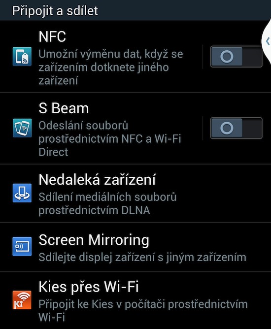 Zapomenout nesmíme ani na S Beam. Tato funkce umí přenášet soubory do jiných zařízení s podporou NFC a WiFi Direct. Přes NFC dojde k inicializaci spojení a samotný přenos pak přes WiFi Direct. Perfektně to funguje třeba při sdílení fotografií a videí z galerie.