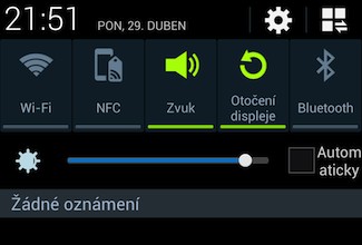 Upravená je i notifikační lišta, kde které se v horní části zobrazují přepínače pro aktivaci/deaktivaci jednotlivých modulů, chytrých funkcí a dalších režimů (rotace displeje, synchronizace, vibrace, tichý profil, NFC…). Zároveň je zde posuvník pro ruční regulaci jasu a opět nechybí prostor pro datum a čas.