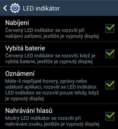 Vlevo nad displejem má své místo signalizační dioda. Ta svítí (bliká) o něco méně výrazněji než u Galaxy S III, ale alespoň tolik neruší v noci. Při nabíjení a vybitém akumulátoru svítí červenou barvou, modrým blikáním vás upozorňuje na zmeškané události a modrým svícením pak na nahrávání zvuku v případě, že je vypnutý displej. Žádné podrobnější nastavení pro notifikace Galaxy S4 bohužel nenabízí, ale to určitě brzy vyřeší aplikace třetích stran.