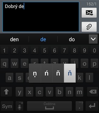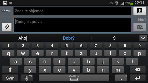Při zadávání textu můžete slova zadávat klasickým vyťukáváním nebo taháním prstu po displeji (swype). V obou případech máte k dispozici český slovník, který se navíc učí nové výrazy a predikce vám při psaní přednostně nabízí ty výrazy, které používáte nejčastěji. V landscape režimu máte více prostoru pro psaní, nicméně pro swype zadávání se více hodí natočení do portrait režimu (nastojato).